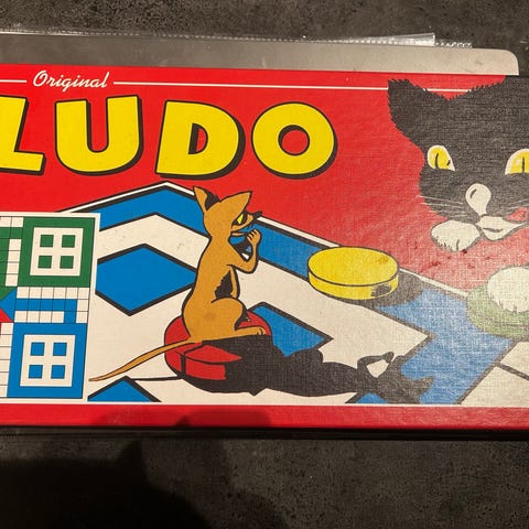 Action Ludo brettspill med fargerike brikker og terning. Spill som kombinerer tradisjonelt Ludo med interaktive elementer.