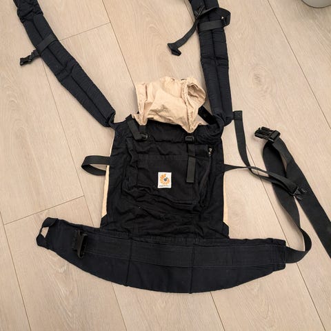 Ergobaby bæresele i svart farge. Designet for å gi støtte og komfort ved bæring av barn. Justerbare stropper og spenner for tilpasning.