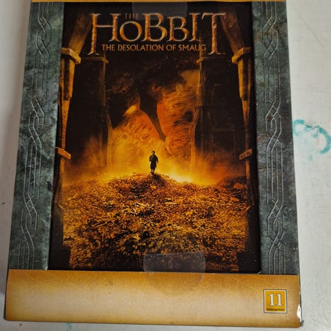 The Hobbit An Unexpected Journey DVD samling med 5 disker. Inneholder film, kommentarer og ekstramateriale. Pakken inkluderer bokslipp med illustrasjoner og kart fra Midgard.