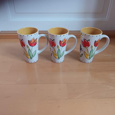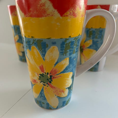 Pastoral Style keramiske krus i 4-pakning med flerfarget design. Hvert krus har blomster- og fuglemotiv med tekst "Pastoral Style" og "Youth Leisure". Selges samlet.