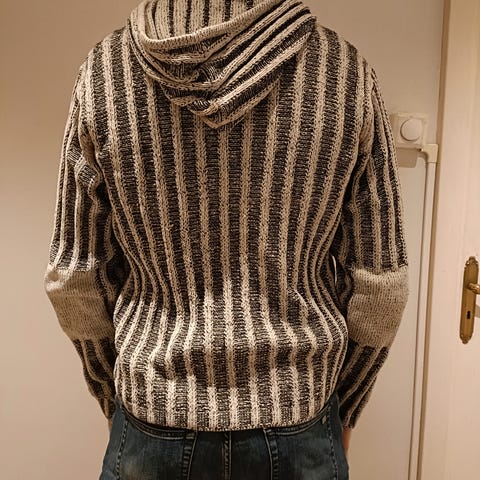 farge: grønn med lilla avslutning i hals og på ermer