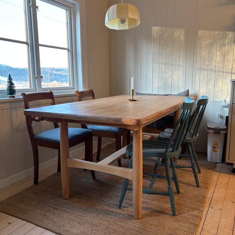 Bordet er godt brukt og understellet er malt men det er stødig og stramt. Bordet er heltre furu og det å bare å pusse i vei.