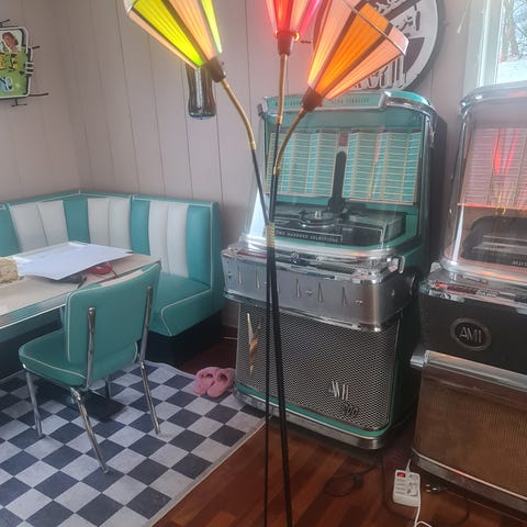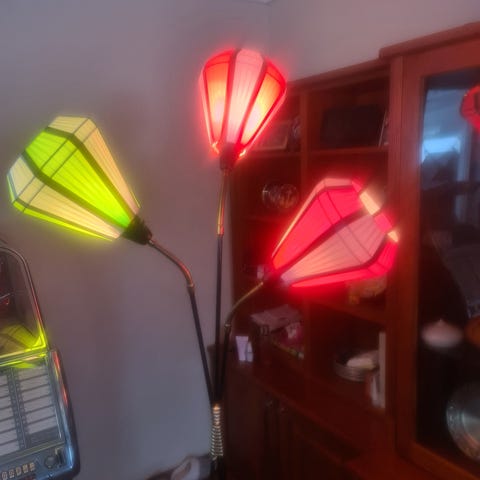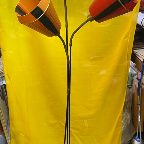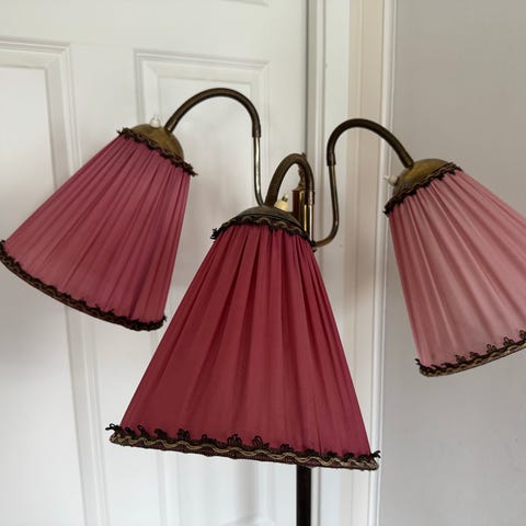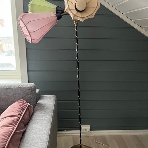 Nyrenovert tivolilampe. Lampa er helt demontert. Foten er pusset og lakkert m/sort lakk. All messing er pusset/polert og lakkert m/klar lakk, for ikke å gulne med tida. Det elektriske er kontrollert og ok. Alle ledninger er skiftet, og det er nytt eurostøpsel.. Alle tre brytere fungerer separat. Det er også montert ny fotbryter, som styrer alle tre lyspunktene samtidig. Lampa leveres med nye LED pærer på 2,1 w. Orginale skjermer er pusset og lakkert m/sort lakk. De er så trekt m/nytt-gammelt plastband fra 60-70 tallet.