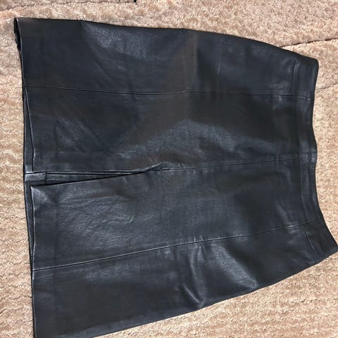 Pent og lite brukt skinnskjørt. Skjørtet har en behagelig strikk i livet, lommer i sidene og har et tynt for/underskjørt. Skjørtet oppleves mindre enn en L og passer fint en S og M.