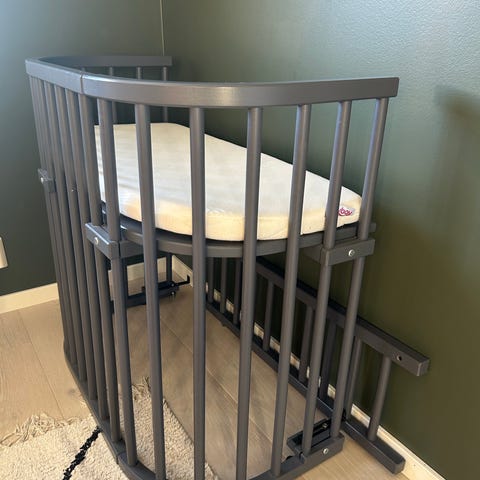 Selger en pent brukt Babybay Bedside crib original, med madrass. Sengen kommer med festekroker. Kan justeres i høyden, og tilpasses høyden på voksensengen. Den åpne bunnkonstruksjonen sikrer god luftgjennomstrømming og hjelper med å holde madrassen tørr og behagelig.