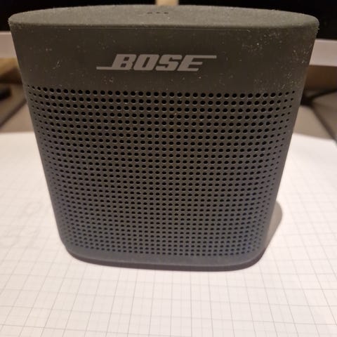 Bose høyttaler med svart front og hvit topp. Designet for lydavspilling i hjemmemiljø.