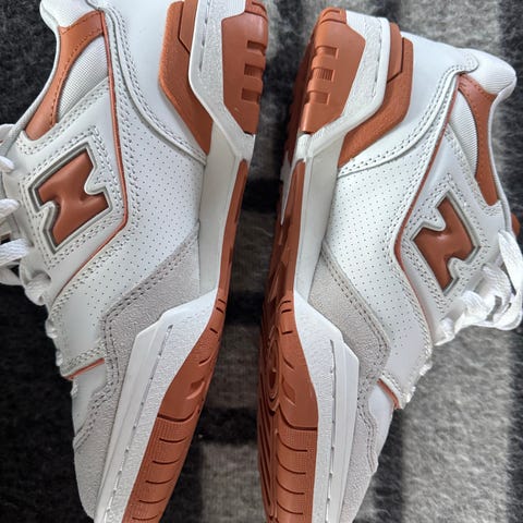 Svært lite brukt New Balance 550 hvite med lilla detaljer. Nypris 1800kr. Bare brukt et par ganger. Ingen slitasje. Overraskende myk såle. Ettersom sålen er hvit, har det kommet litt farge under sålen men ingen andre merker.