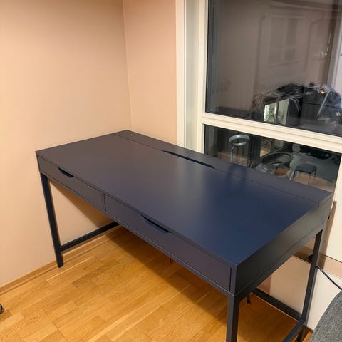 Skrivebordsplate av poppel kryssfiner med Alex skuffeseksjon og ben fra IKEA. Platen er behandlet med hvitpigmentert Osmo hardvoksolje, og kan enkelt tilpasses ved behov.