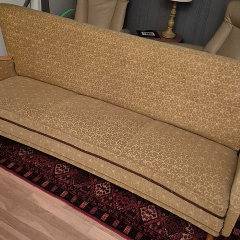 Retro sofa med bord gis bort. Ingen flekker, men trekk kan tas av og vaskes. Kjøper må hente selv. Ta kontakt for adresse ved interesse.