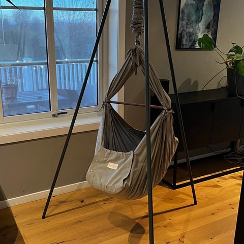 Selger en pent brukt Moonboon hengevugge med stativ, madrassbeskytter og formsydd laken. Hengevuggen ble kjøpt ny av oss i August 2025 og er brukt frem til Desember. Den er av fargen Seagrass og har hvitt stativ.