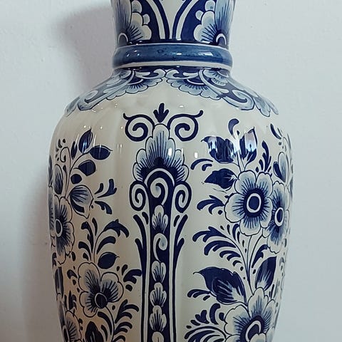 Vakker Delft-porseleensvase med håndmalte ornamenter og blomstermotiv i klassisk blå/hvit stil.