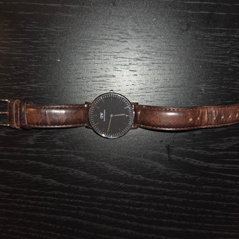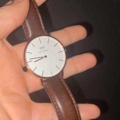 Daniel Wellington herre klokke med brun skinnrem og rund urskive. Klokken har et minimalistisk design med hvit urskive og gullfarget kasse. Remmen er laget av skinn. Selges siden den ikke blir brukt lenger, pent brukt uten merker