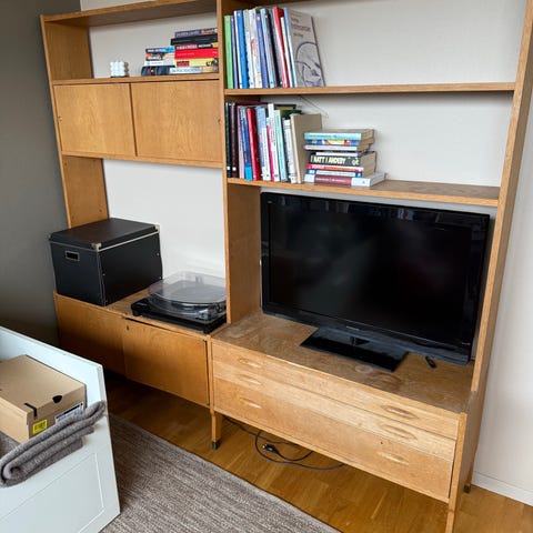 Unik hylle med plass til vinylplater! Elsket denne i leiligheten vi har nå, men passer ikke til nytt hjem. Selges derfor grunnet flytting. Vi har hatt to av de tre delene oppe, se bilde med original farge for hele i komplett størrelse. Legger ved mål. Hyllen er ekte vintage og treverk, vi brukte maling fra Jotun. 🩷