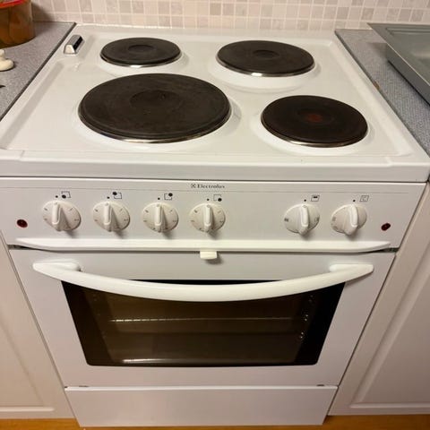 Gammel - ca. 20 år - men alt fungerer som det skal. Sliten pakning til ovnsdøra.