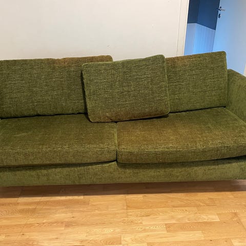 Sofa med to lenestoler gis bort samlet. Eldre møbler av god kvalitet. Noe merker på endestykkene av sofaen etter at kattene har klort, se bilder. Et armlene på en stol er løst, me fikses fort med litt lim