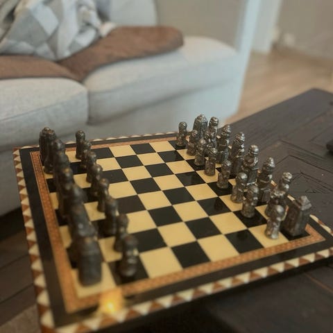 Sjakkbrett i tre med brikker og oppbevaringsboks