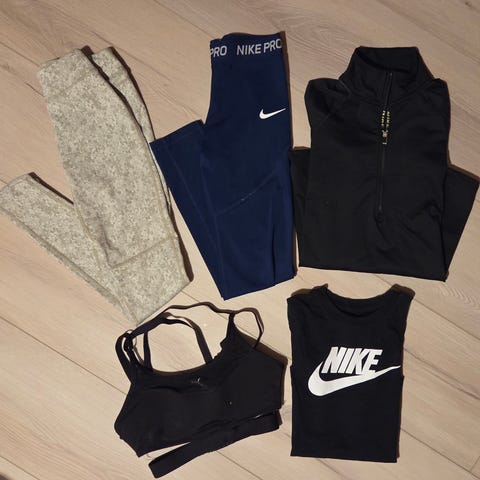 Gymshark treningsklær for kvinner i størrelse S. Inkluderer ulike plagg egnet for fitness, med forskjellige farger og materialer. Noe ubrukt!