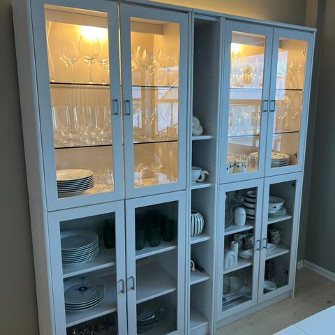 • Øverste del: Overskap med glassdører og integrerte hyller, perfekt for glass, servise eller pynteting.