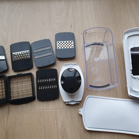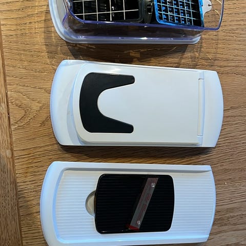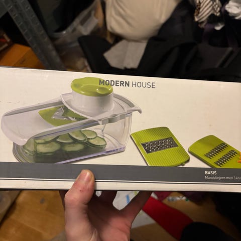 Mandolinen er tilsvarende denne, men en eldre versjon: https://www.kitchn.no/kjokken/kjokkenutstyr/mandolinjern/modern-house-basis-mandolinjern-gra-hvit/