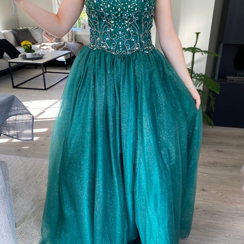 Grønn ballkjole fra Lychinor selges. Brukt av jente på 183cm, med lave sko. Brukt en kveld, pent brukt. Nypris var 4200kr.