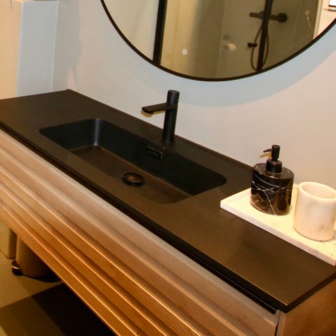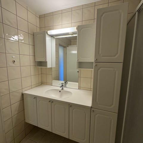 Baderomsmøbel med dobbel vask og armaturer + høyskap