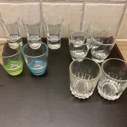 Sett med blått glass inneholdende ulike serviseelementer og dekorative gjenstander. Inkluderer tallerkener, boller, skåler, karaffel, vinglass og diverse små beholdere. Materialet er gjennomfarget blått glass, egnet for servering og dekorasjon.