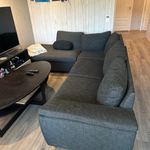 Praktisk Ikea Ektorp sofa gis bort. Sjeselongen kan plasseres der man ønsker. Har ekstra trekk som følger med i rødt. Trekkene kan enkelt vaskes. Noe bruksmerker finner man, men ingen hull. Hoveddelen kan deles i to for enklere transport. Sofaen er allerede demontert og klar for rask henting! Ta kontakt om du lurer på noe.