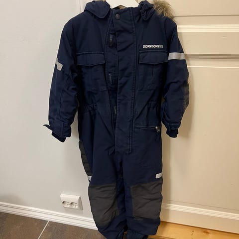 Didriksons barne vinterdress i størrelse 110, farge grønn, laget av polyamid materiale. Designet for gutter med funksjoner som hette, justerbare mansjetter og forsterkede områder på bena for økt slitestyrke.