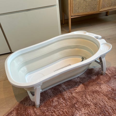 Sammenleggbart badekar. Genialt for å la barna få bade i dusjen!. BiBaBad er fleksibelt i lengden og bredden så det kan tilpasses det enkelte baderom. Har fint fått plass til to små barn samtidig. Består av en lett og regulerbar ramme i aluminium og en badedel i vanntett stoff, Kan brukes i dusjkabinett, eller over et sluk. Propp for enkel tømming. I sammenklappet tilstand kan det også henge på veggen og tar da minimalt med plass.