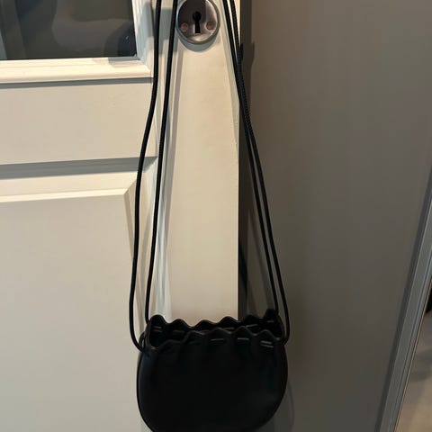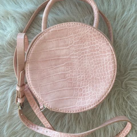 COS rund gul skulderveske i semsket skinn for dame. Noen bruksmerker.