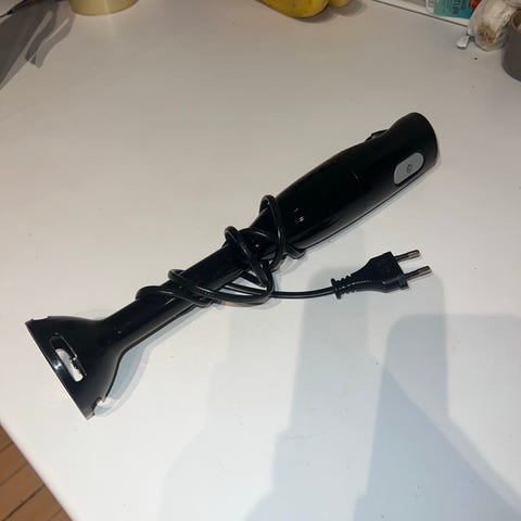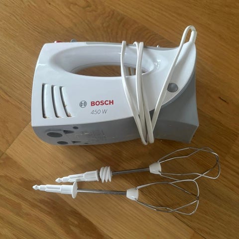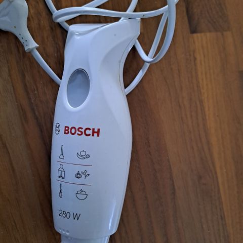 Bosch Ergomixx 600 W stavmikser i hvit farge med avtagbar metallstav. Egnet for miksing og purering av matvarer. Går på strøm. Kjøpt for ca. 1,5 år siden. Vi mistet den i bakken for 1 år siden og har brukt den frem til nå, men har kjøpt ny pga. sprekken. Virker fortsatt, og får jobben gjort.