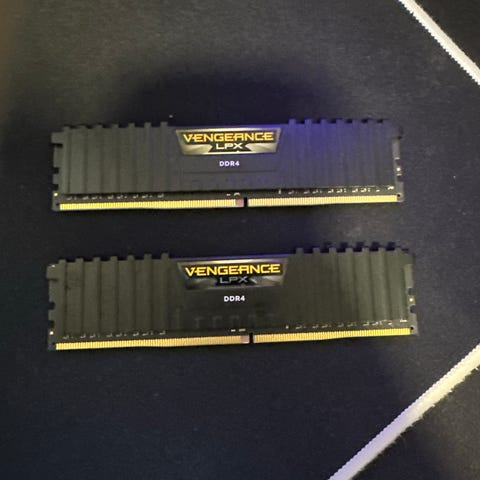Corsair Vengeance LPX DDR4 RAM med totalt 32GB (2x16GB) kapasitet, 3200MHz hastighet. Passer for datamaskiner som støtter DDR4-minne.