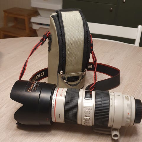 Canon EF 70-200mm f/2.8L IS II USM samt EF 2x III teleconverter. Kjøpt 2013/2014 men veldig pent brukt. Objektivet har hatt beskyttelse filter stående på fra dag 1 og ser generelt plettfritt ut.