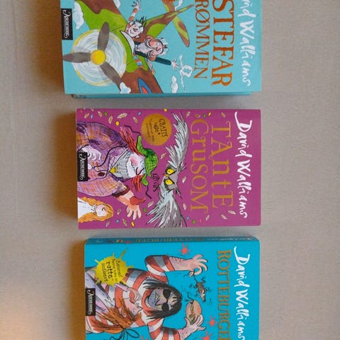 David Walliams barnebøker med titlene Tante Grusom, Rotteburger, Midnattsorgen, Gutten-kjølen, og Bestefar. Bøkene er veldig morsomme og er beregnet for barn. Ca 8-12 år. Tre stk som ny og to pent brukt. Fire hardback og en pocket.