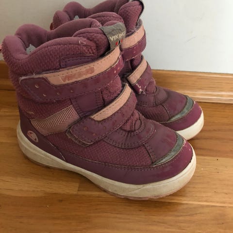 Viking barnesko unisex i størrelse 28. Skoene er svarte med borrelåsfester og har en fôret innside som gir varme. Egnet for barn og tilpasset bruk i kaldere vær.