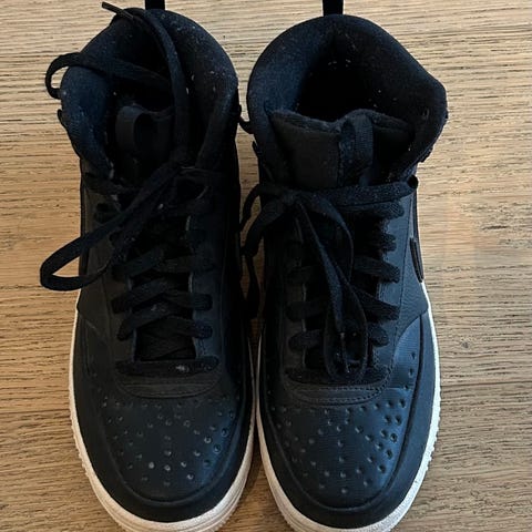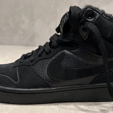 Nike barn sko for gutt i størrelse 40. Skoene er svarte med hvit såle, designet for barn med høy ankelstøtte og snøring. Materialet ser ut til å være en kombinasjon av tekstil og syntetiske materialer, egnet for daglig bruk.