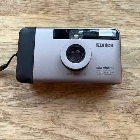 Selger et flott Konica Z-up 28 W i nærmest strøken tilstand, et populært point-and-shoot analogt filmkamera fra 1990-tallet. Kameraet bruker vanlig 35mm film og er kjent for sin brukervennlighet og vidvinkel linse, og er ettertraktet for gatefotografi og landskapsfotografi. Det er derfor et supert kamera for folk som prøve seg på filmfotografi eller oppgradere fra engangskameraer, og et supert alternativ til Olympus Mju og Olympus Mju II modellene som har blitt veldig populære i det siste.
