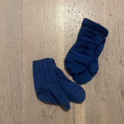 Hjemmestrikk. Et par votter og et par sokker selges samlet. Tror det tilsvarer str 86.