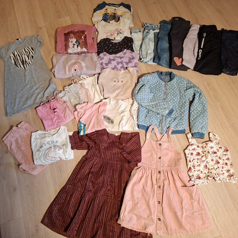 Alle plaggene er i str 122/128. Buksene har praktisk stramming på innsiden. Eneste anmerkningen jeg har funnet er ett par flekker på den ene buksa, ikke forsøkt fjernet. Noen av plaggene er så godt som ubrukte. Selges samlet