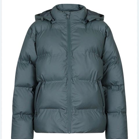 Oversized pufferjakke laget i krøllet nylonstoff med vannavstøtende finish og polyesterpolstring. Har avtakbar hette, ermer med indre ribbemansjetter, lommer foran, innerlomme på brystet, og elastisk snøring for å regulere bredden.