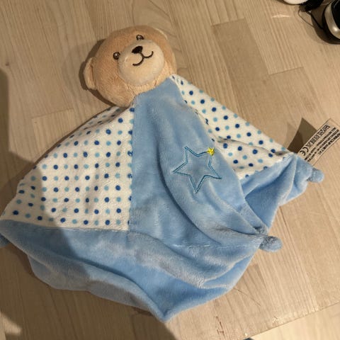 Bamse som holder et fleecepledd og en koseklut med bamse 30×30 cm.