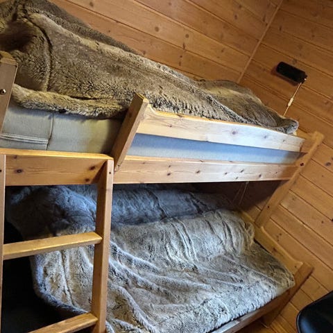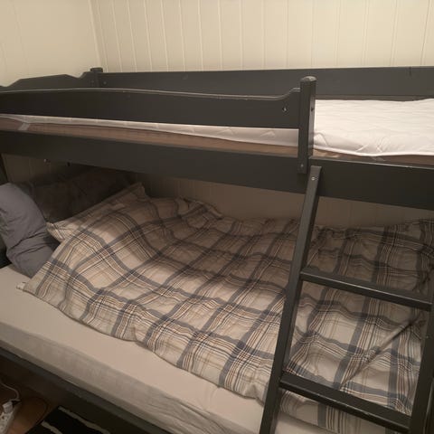 Familiekøyeseng med sengebunner og skummadrasser selges. Støttefot i tre under senga. Står montert, må demonteres før henting.