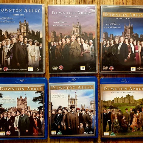 Downton Abbey Series One Blu-ray DVD inneholder første sesong av TV-serien Downton Abbey. Produktet inkluderer blu-ray plater med episoder, bonusmateriale som kommentarer, slettede scener, en bok om historien bak serien, og en dokumentar om produksjonen av Downton Abbey. Serien har skuespillere som Maggie Smith og Hugh Bonneville, og handlingen foregår i en stor herskapshus-setting med fokus på livet til adelsfamilien og deres tjenere. I flott stand. Sender.