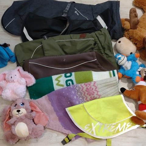 Diverse hundeutstyr for valp eller liten hund. Halsbånd, kobbel, klær, leker, refleksvest og potesokker. Pent brukt.
