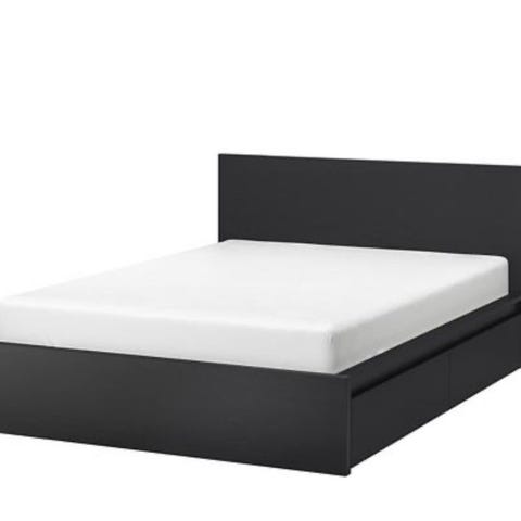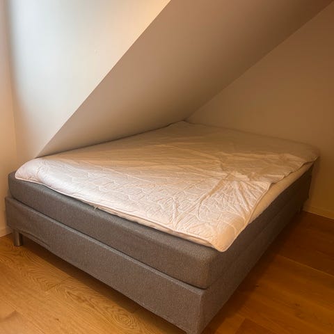 Dobbeltseng fra IKEA med sengegavel. 180 x 200 og 2 x fast/hvit madrass, 90x200 cm.