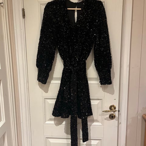 Midikjole fra byTiMo. Modellen heter "Jacquard Midi Dress". Den er elegant, med feminint snitt og innsvinget med strikk i midjen. Den har litt puff over skuldrene og brede mansjetter. Lommer på sidene. Grønnfargen (emerald) er ordentlig fin. Den er kun brukt én gang i bryllup og er like fin som ny.