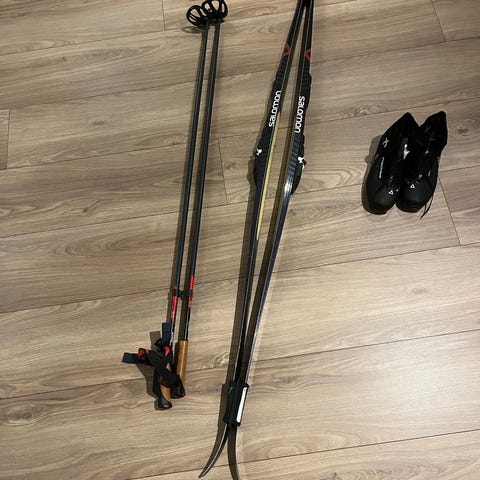 Skiene og stavene er kjøpt til en person på pluss/minus 75 kg! Høyde 174 cm.