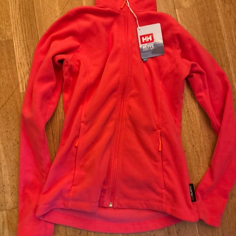 Teddyjakke fra Helly Hansen med hette. Jakken har glidelås foran, høy krage og praktiske lommer med glidelås på siden. En lomme med glidelås finnes også på brystet.