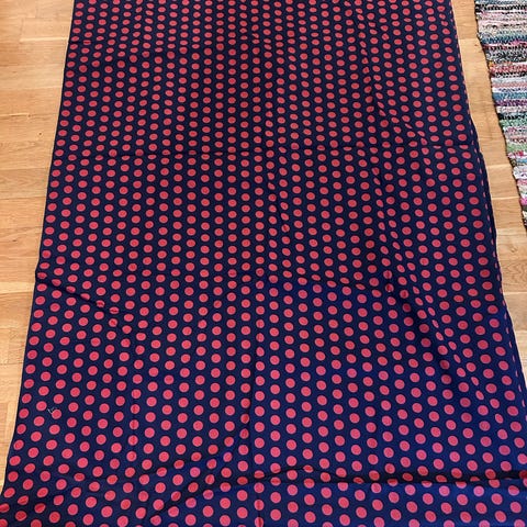 Bomullsstoff med mønster av store hvite prikker på grønn bakgrunn. Bredde 125 cm, 157 cm lengde