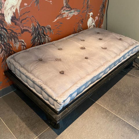 Lite brukt grå velur stoff sengegavel. 120 cm